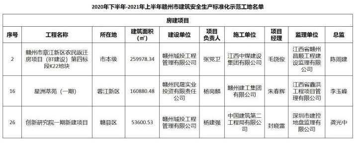 日前,贛州市住房和城鄉(xiāng)建設局公布了2020年下半年-2021年上半年贛州市建筑安全生產標準化示范工地名單,由贛州城投集團建設的贛州市章江新區(qū)農民返遷房項目(BT建設)第四標段K22地塊、星洲萃苑(一期)、中科院贛江創(chuàng)新研究院一期新建項目共3個項目獲獎。